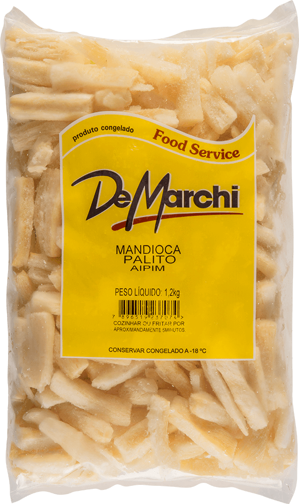 Fritas: Aqueça o óleo para fritura em imersão e, após aquecido, coloque as mandiocas congeladas em pequenas porções, virando-as uma vez para igualar o ponto de fritura.