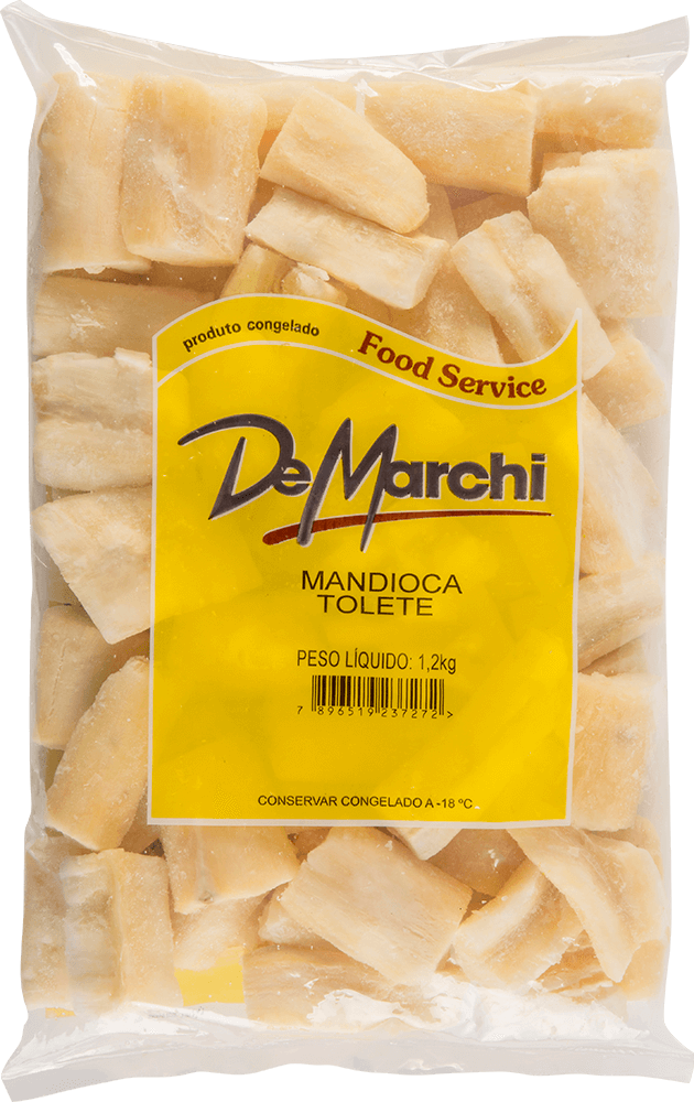 Fritas: Aqueça o óleo para fritura em imersão e, após aquecido, coloque as mandiocas congeladas em pequenas porções, virando-as uma vez para igualar o ponto de fritura.